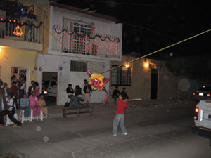 Of course, the fix is in because no one wants one of the first few children to break the piñata right away. Every kid should get a turn to hit the piñata. Before a child gets a turn, he or she must be blindfolded and spun around a few times. This child is so disoriented by then that he or she must be pointed in the direction of the piñata and starts swinging wildly at the piñata. Meanwhile, everyone sings the piñata song: “Dale, dale, dale, / No pierdas el tino / Porque si lo pierdes / Pierdes el destino.” Everyone sings the piñata song repeatedly until the child swinging the stick gets so sick of hearing it that he or she finally breaks the piñata.