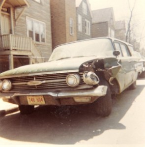 My father always had trouble staying in his lane. On the expressway, in the right lane, he would exit on the right if he didn’t focus on staying in his lane. Before I started driving, I thought staying in your lane was the most difficult driving feat possible. My father would make everyone be quiet whenever we approached exit ramps. In the picture of my father’s station wagon, you can see the result of his not staying in his lane. he was driving northbound on Damen Avenue at 47th Street. That was the site of the infamous Damen overpass in Back of the Yards. The left two lanes took you over the overpass. However, the right lane allowed drivers to veer right and avoid going on the overpass. Well, my father was in the right lane when the exit lane pulled him to the right. Unfortunately, he crashed into the concrete barrier dividing the lanes despite the flashing yellow warning light and warning sign. Luckily for me , he was alone while driving.