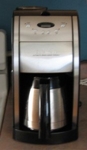 So, I decided to splurge on a new coffee maker. I bought a Cuisinart Grind and Brew coffee maker in 2003 and enjoyed its coffee until about three months ago. It had a timer, so I was able to set it up the night before and literally wake up and smell the coffee. About two years ago, my beloved Cuisinart stopped functioning like new and I tried to fix it–following in my father’s footsteps–but I was lucky to put it back together again without improving its performance. The only thing I got out of the experience was a headache, minor cuts on my fingertips, and a very lame blog entry. But I continued using the coffee maker until about two months ago when I could no longer disassemble the grinder to wash it. I tried everything to pry it out, but it was more stubborn than me.