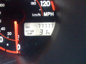 Okay, if you insist, I’ll tell you. I was driving to school today when I suddenly looked at the odometer and read 77777. My car’s only three years old and I’ve already put on 77,777 miles (My 2005 Pontiac Vibe doesn’t display tenths of miles). And I don’t consider myself a heavy driver. I seem to spend more time reading books than driving. So how did I manage to drive so many miles? I really don’t know. However, I stopped the car immediately and took a poor-quality picture–as is characteristic of my photography skills–of the odometer to mark this blessed occasion.